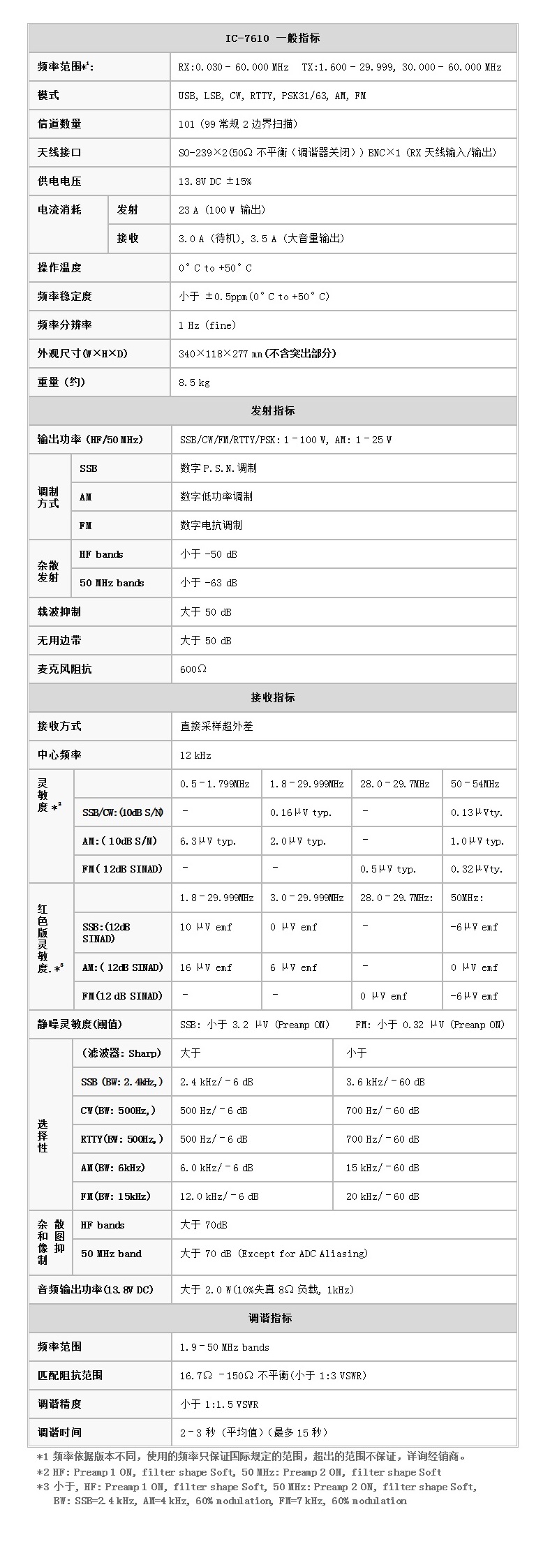 IC-7610多功能短波電臺主要技術(shù)參數(shù)