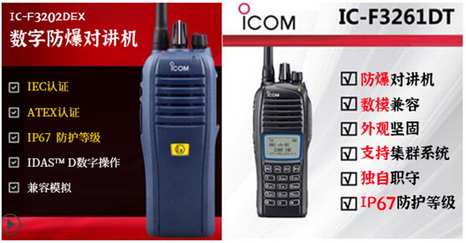 目前在售的ICOM對講機防爆主要美國和歐洲認證標準的可轉換成中國相應標準的防爆對講機,常見品牌如早期的IC-F51/61防爆防水對講機,IC-F3161/4161DT,IC-F3261/4261DT防爆對講機和IC-F3202DEX/4202DEX氫氣防爆對講機。它們都是已經(jīng)在防爆行業(yè)應用多年的防爆對講機品種,值得用戶信賴和推薦。