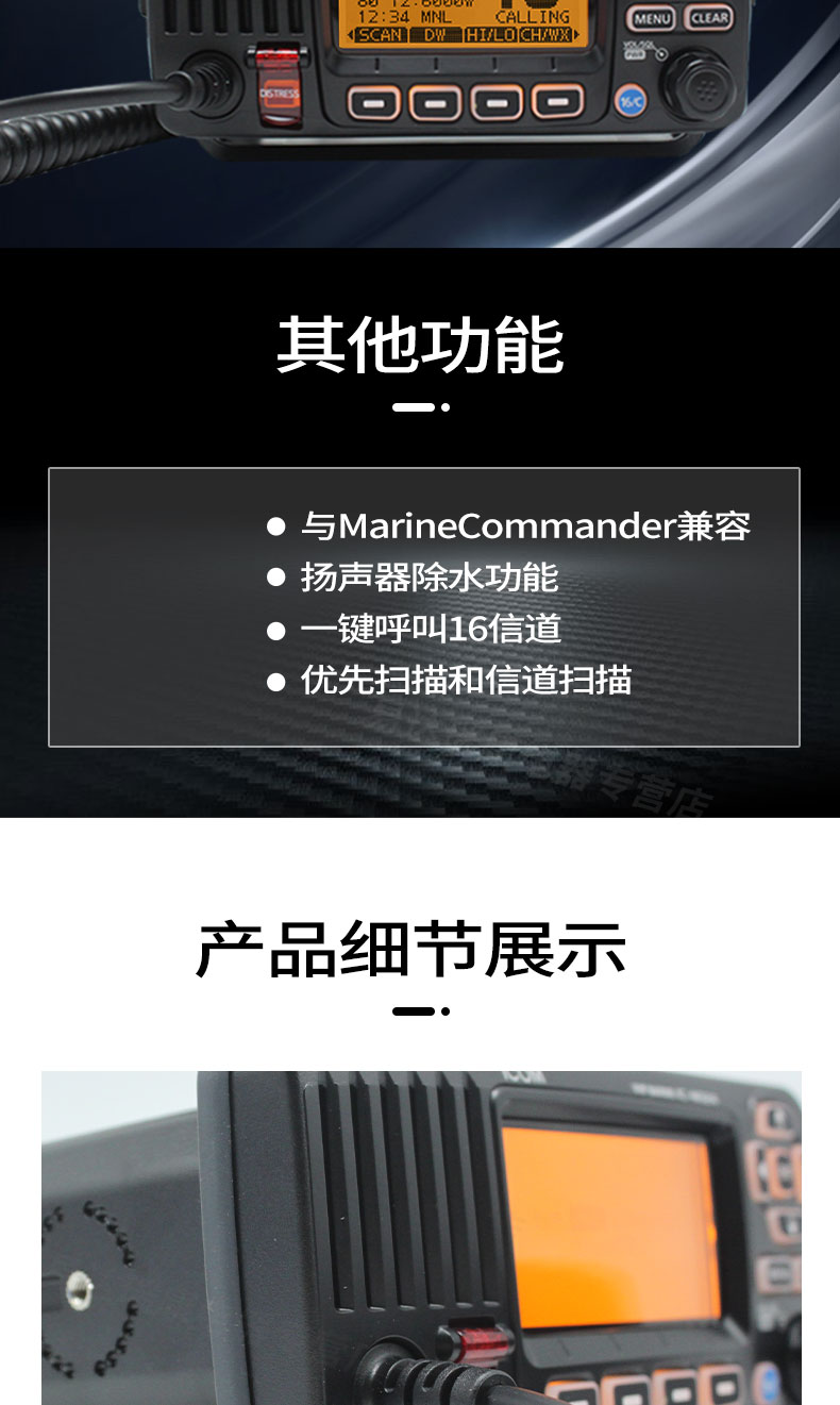 • 海事甚高頻電臺(tái),內(nèi)置通用海事頻點(diǎn)。DSC功能,在遇險(xiǎn)是及時(shí)發(fā)出緊急求救信號(hào)。