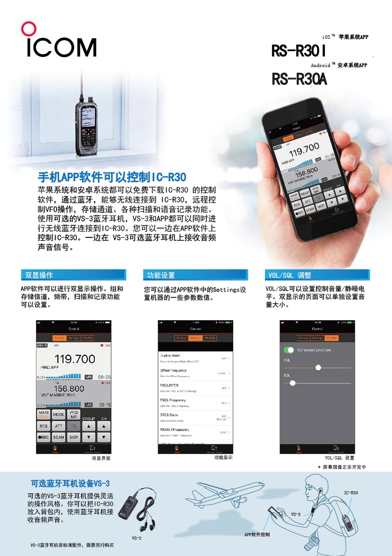 蘋果系統(tǒng)和安卓系統(tǒng)都可以免費下載IC-R30的控制軟件,通過藍牙,能夠無線連接到IC-R30,遠程控制VFO操作,存儲通道 各種掃描和語音記錄功能。使用可選的VS-3藍牙耳機,VS-3APP都可以同時進行無線藍牙連接到IC-R30.您可以一邊在APP上控制IC-R30.一邊在VS-3可選藍牙耳機上接收音頻聲音信號。