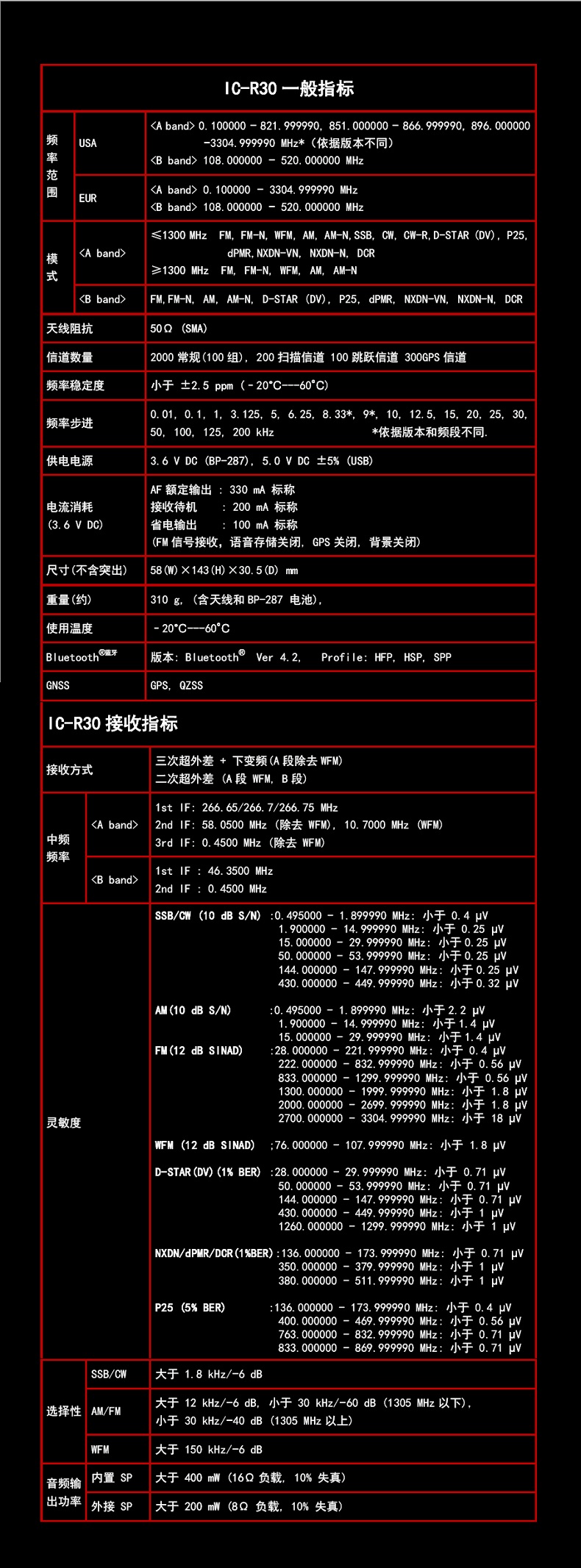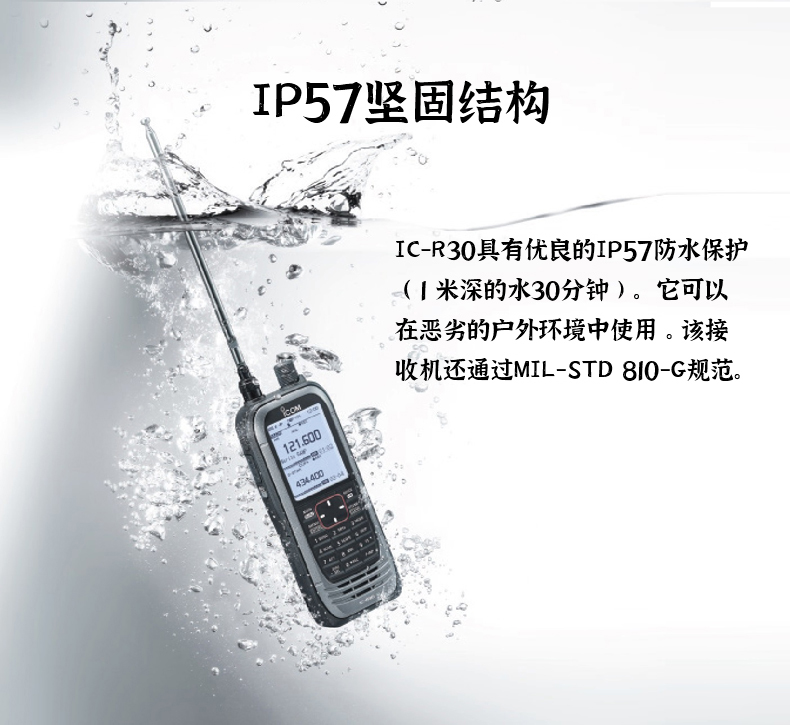 IP57堅固結構  IC-R30具有優(yōu)良的IP57防水保護(1米深的水30分鐘)。它可以在惡劣的戶外環(huán)境中使用。該接收機還通過MIL-STD 810-G規(guī)范