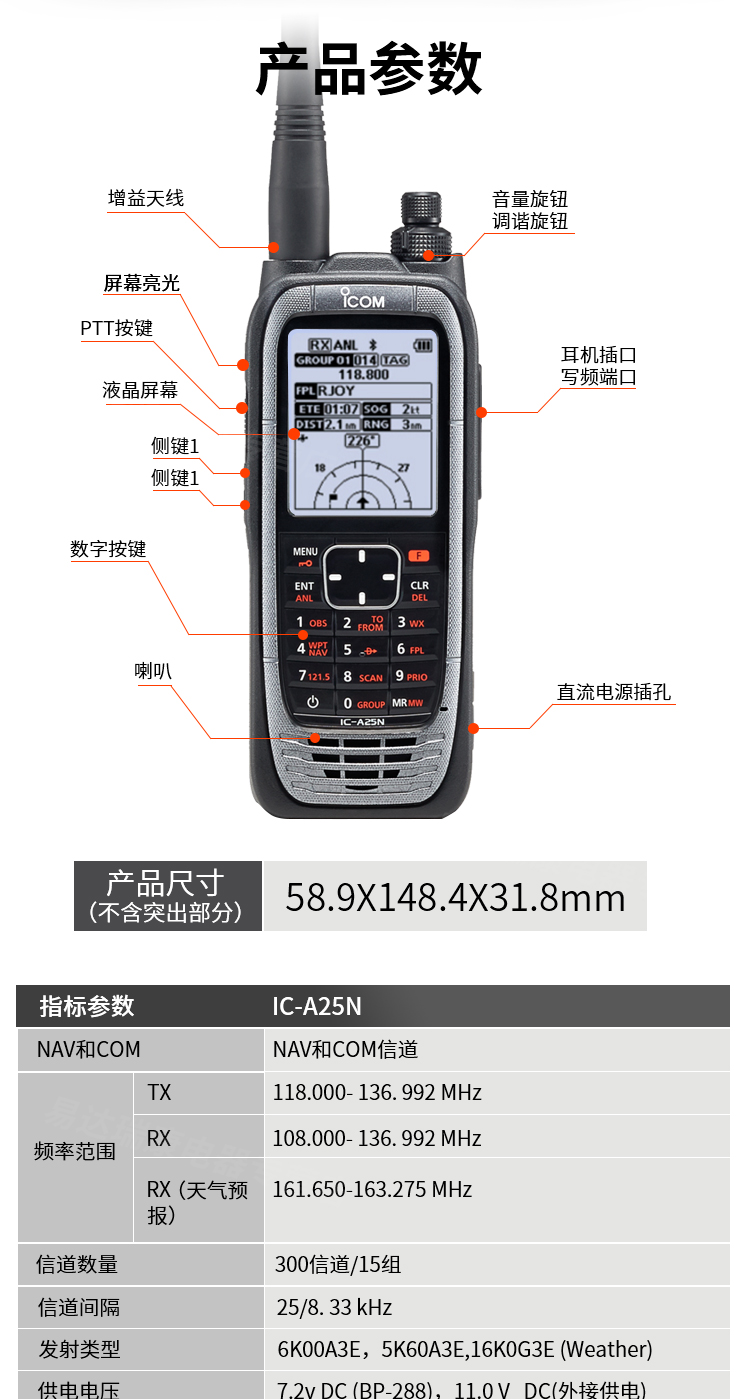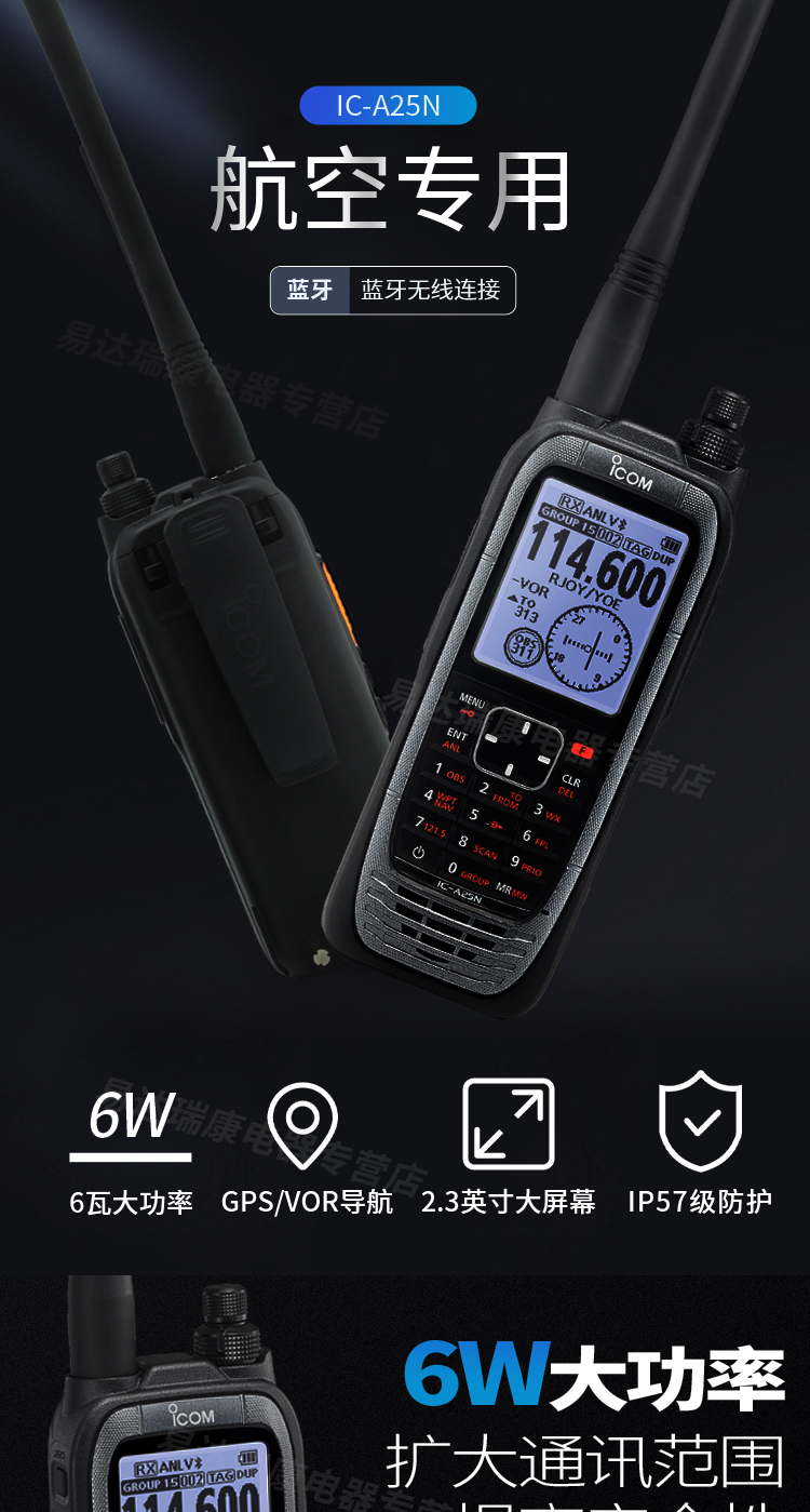• 118-136MHz航空頻段,一鍵121.5MHz緊急呼叫信道,6W大功率輸出。