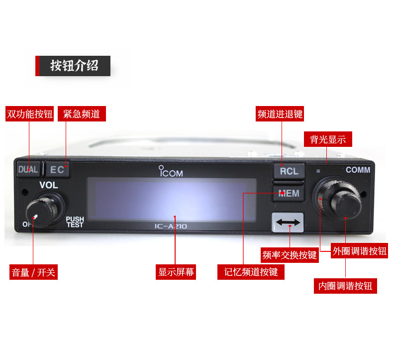 航空頻段通信臺具有雙頻率窄面板顯示,配件全可移動固定插入安裝方式,白光字符顯示,自動靜噪,12V/24V DC供電,內(nèi)置對講功能側(cè)音功能。