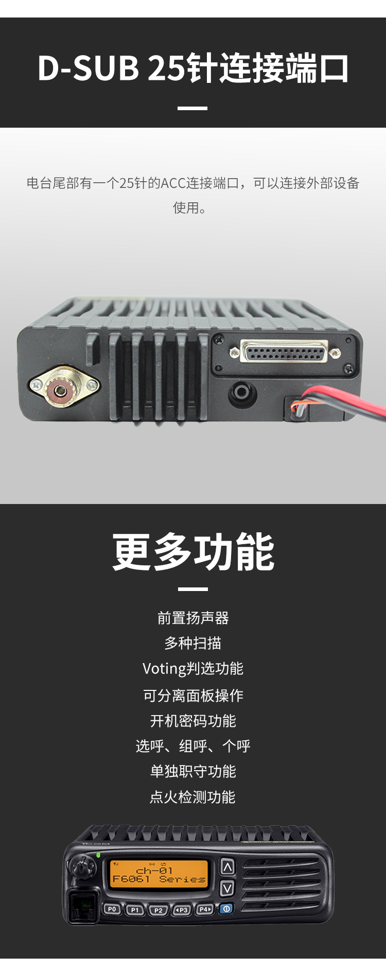 全點(diǎn)陣LCD顯示屏,可分離式前面板,前置揚(yáng)聲器。Voting判選功能,在集群模式下選擇信號(hào)良好的基站進(jìn)行通訊。512個(gè)頻道,45W大功率輸出。
