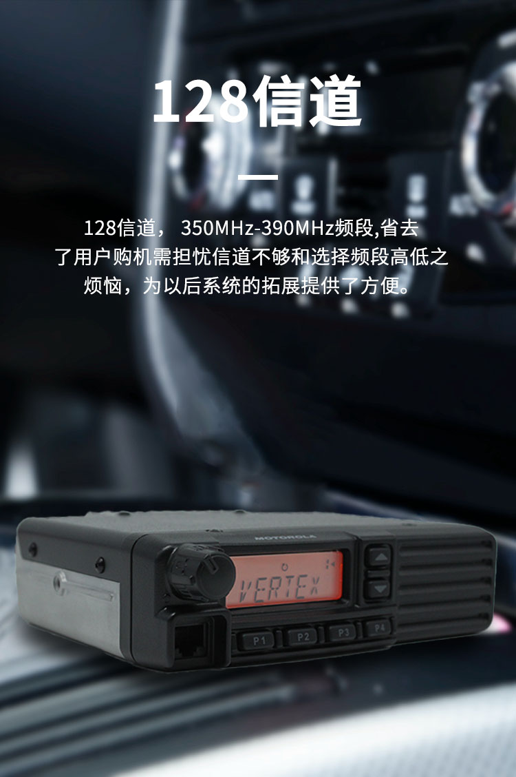128個(gè)信道,25W高功率輸出,寬頻帶350-390MHz,遠(yuǎn)程停用、啟用功能。緊急報(bào)ARTS圈外提示功能,超出通訊范圍會發(fā)出提示,語音加密功能(可選)。