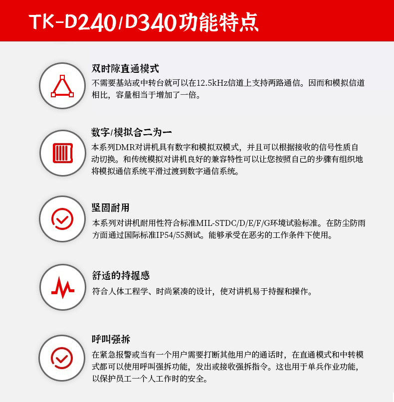 雙時(shí)隙TDMA,同時(shí)發(fā)射語音和數(shù)據(jù)。 數(shù)字/模擬合二為一,兼容性高 使用5-5-90待機(jī)可達(dá)10小時(shí)以上。 堅(jiān)固耐用 呼叫強(qiáng)拆下線功能 雙時(shí)隙直通模式 舒適的持握感 清晰、強(qiáng)勁的語音