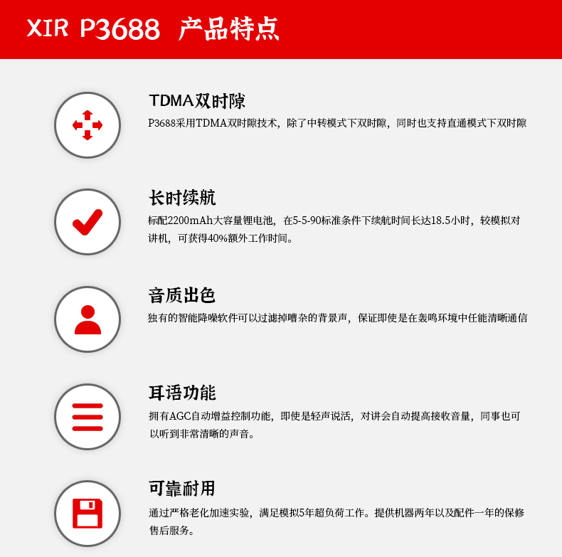 摩托羅拉Xir P3688是一款商用對講機(jī),功率為4W。 標(biāo)配2200mAh大容量鋰電池,在5-5-90條件下可續(xù)航18.5小時(shí)。 降噪軟件可以降低噪音,提高通訊性能。