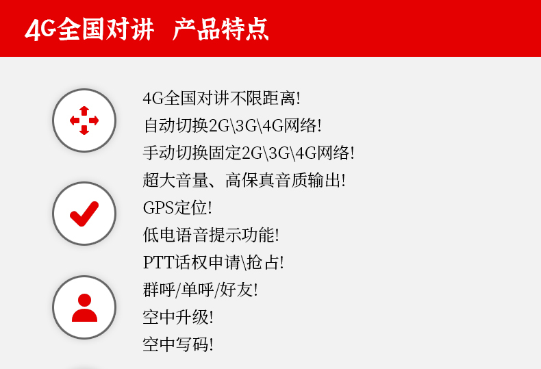 4G全國對講不限距離! 自動切換2G\3G\4G網(wǎng)絡(luò)! 手動切換固定2G\3G\4G網(wǎng)絡(luò)! 超大音量、高保真音質(zhì)輸出! GPS定位!