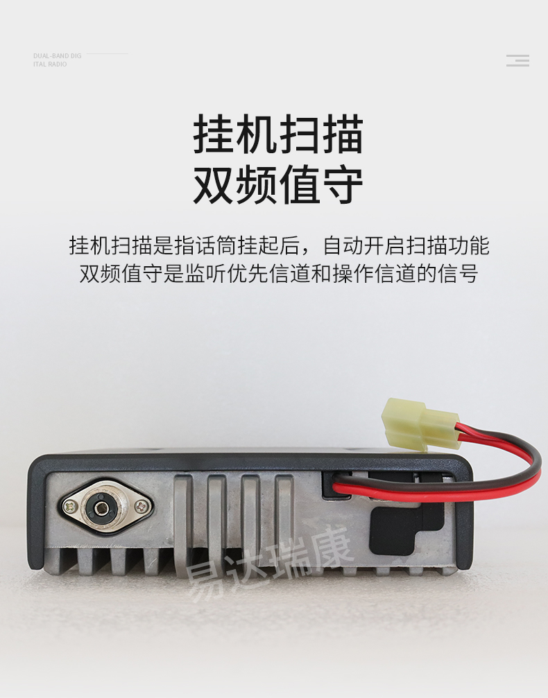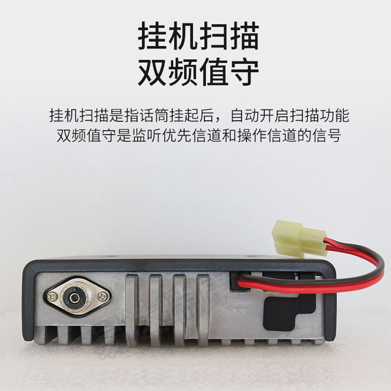 掛機(jī)掃描和雙重回望查看功能  雙重回望查看是在優(yōu)先頻道和操作頻道之間查看,掛機(jī)掃描功能是指車臺手咪掛到掛鉤上面后,主機(jī)自動開啟掃描功能,掃描停止在優(yōu)先頻道或者當(dāng)先顯示的頻道,(需要預(yù)先編程)。